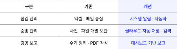"점검표는 엑셀, 공문은 워드, 사진은 휴대폰... 보고는 하지만 정작 현장은 관리되고 있다는 느낌이 안 듭니다."